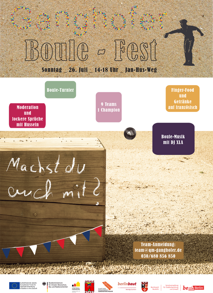 Die zweite Bauphase in der Durchwegung Gerlachsheimer Weg/Kirchgasse/Jan-Hus-Weg läuft gerade und wenn sie fertig ist, wird gefeiert! Dazu veranstaltet das Quartiersmanagement ein Boule-Fest mit Kulturprogramm: Moderation und lockere Sprüche mit Hussein, Finger-Food und Getränke auf französisch sowie Boule-Musik mit DJ XLA.