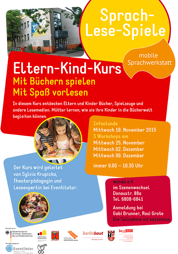 In diesem Kurs entdecken Eltern und Kinder Bücher, Spielzeuge und andere Lesemedien. Mütter lernen, wie sie ihre Kinder in die Bücherwelt begleiten können. Der Kurs findet im Rahmen des Der Kurs ist Teil des Bildungsprojektes "Mobile Sprachwerkstatt" des Trägers Eventilator. Er wird geleitet von Sylvia Krupicka, Theaterpädagogin und Leseexpertin bei Eventilator und findet bei Wanda e.V. im Szenenwechsel, Donaustr. 88a statt.Infostunde: