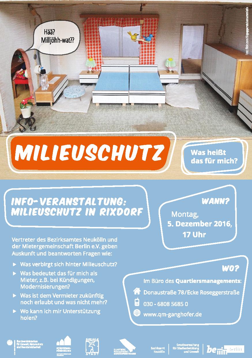Seit Juli 2016 ist für das Gebiet "Rixdorf" die Milieuschutzverordnung in Kraft. In Milieuschutzgebieten sind Rückbau, die Änderung oder die Nutzungsänderung baulicher Anlagen genehmigungspflichtig. Zielgruppe ist die vorhandene Wohnbevölkerung, Neubau oder Ladenlokale sind hiervon nicht betroffen. Die Genehmigungspflicht erstreckt sich auch auf bauordnungsrechtlich genehmigungsfreie Vorhaben wie z.B. energetische Sanierung, oder Grundrissveränderungen ohne tragende Wände.