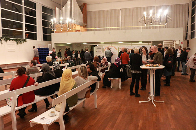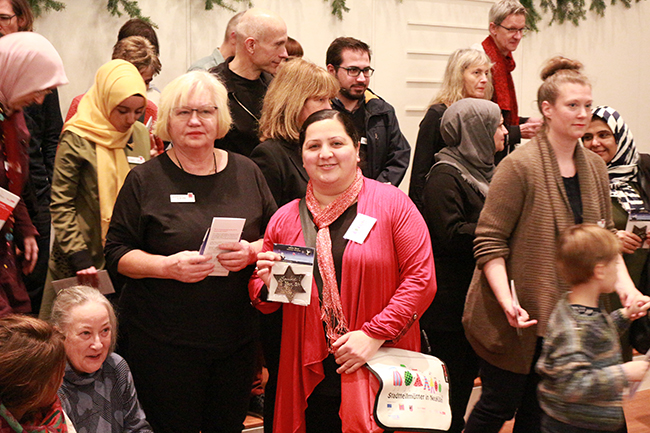 Zwischen den einzelnen Redebeiträgen verzauberte das Duo „NOS ENVOLÉES“ mit Hang und Cello die Zuhörer und zum Abschluss spielte der Bläserchor der Brüdergemeine Weihnachtslieder. Danach gab es ein sehr leckeres veganes Buffet, das vom Café Pêle-Mêle aus der Innstraße zubereitet wurde. Dabei hatten alle Besucherinnen und Besucher die Möglichkeit, sich in entspannter Atmosphäre weiter kennenzulernen und auszutauschen.