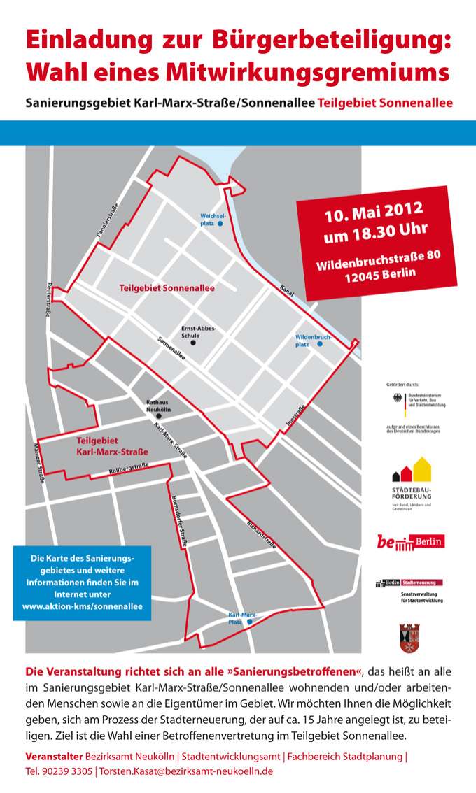 Die Veranstaltung richtet sich an alle "Sanierungsbetroffenen", das heißt an alle im Sanierungsgebiet Karl-Marx-Straße/Sonnenallee wohnenden und/oder arbeitenden Menschen sowie an die Eigentümer im Gebiet.