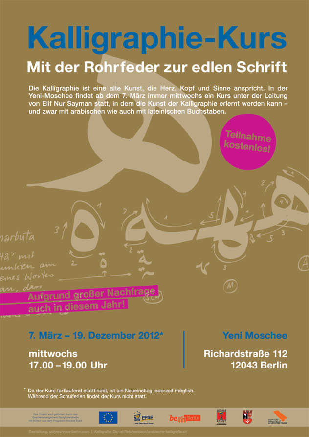Die Kalligraphie ist eine alte Kunst, die Herz, Kopf und Sinne anspricht. In der Yeni-Moschee findet ab dem 7. März immer mittwochs ein Kurs statt, in dem die Kunst der Kalligraphie erlernt werden kann - und zwar mit arabischen, wie auch mit lateinischen Buchstaben. Da die Kurse bis Dezember fortlaufend stattfinden, ist ein Neueinstieg jederzeit möglich noch bis Mitte Dezember.
