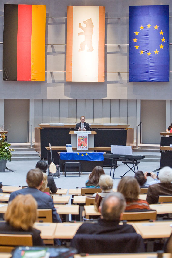 Mehr als 400 Mitglieder der Berliner Quartiers- und Vergabebeiräte aus den Berliner Quartiersmanagementgebieten folgten der Einladung des Bürgermeisters und Senators für Stadtentwicklung und Umwelt, Michael Müller am 8. März ins Berliner Abgeordnetenhaus. In seiner Rede würdigte Müller - wie auch der Präsident des Abgeordnetenhauses, Ralf Wieland und die Staatssekretäre Rackles und Dilmaghani, das besondere Engagement der ehrenamtlich Tätigen in den Quartiersmanagementgebieten. Alle Festredner stellten heraus, dass die wichtige Arbeit in den Quartieren ganz entscheidend zum sozialen Zusammenhalt in den benachteiligten Stadtteilen beitrage und deshalb für ganz Berlin von Bedeutung sei.