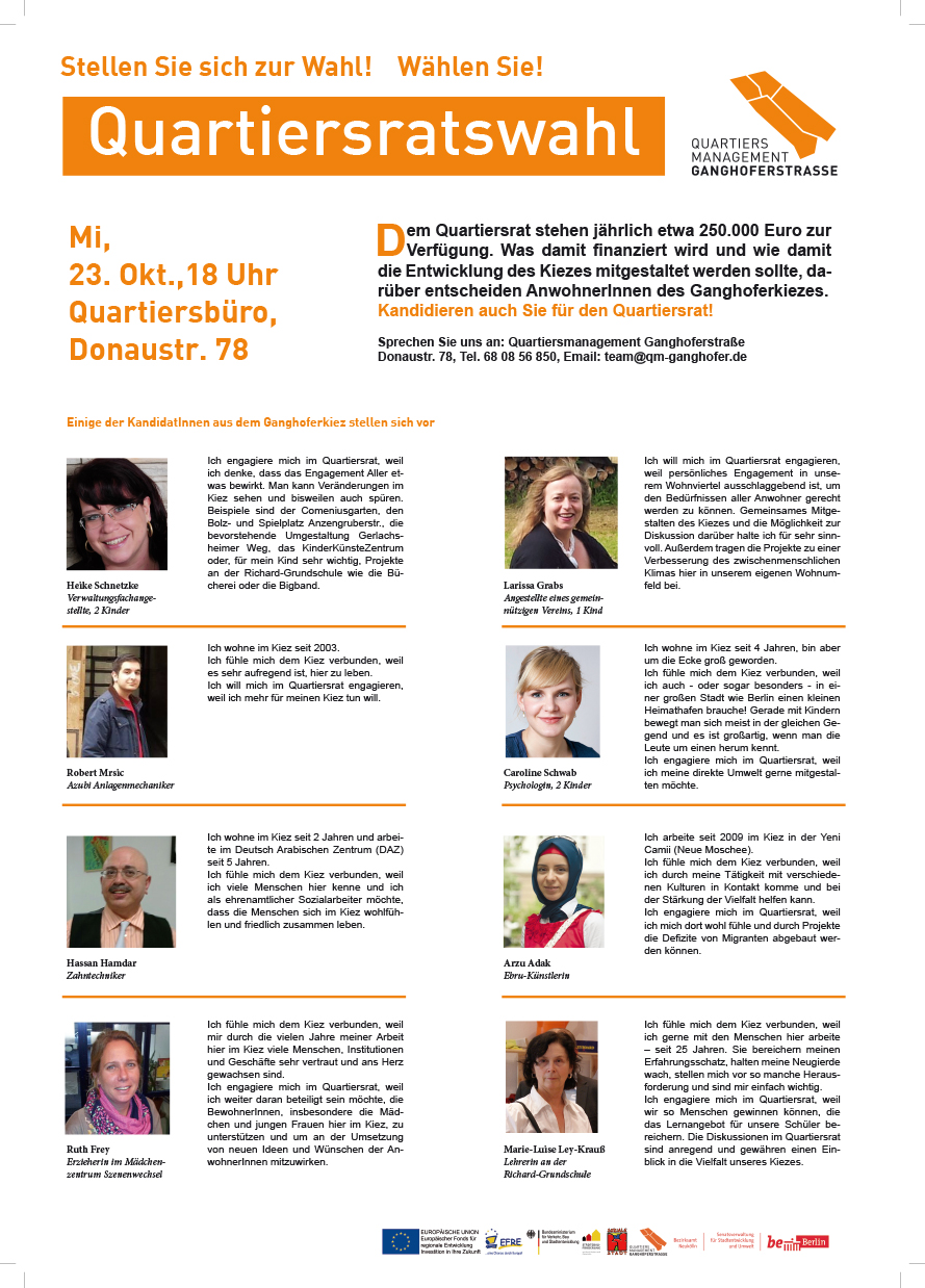 >> Flyer zur Wahl (mit einem Grußwort von Bezirksstadtrat Thomas Blesing und Kommentaren von Mitgliedern des Quartiersrates)