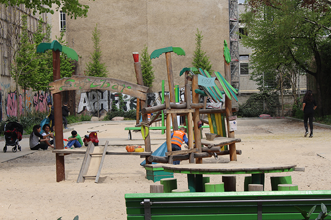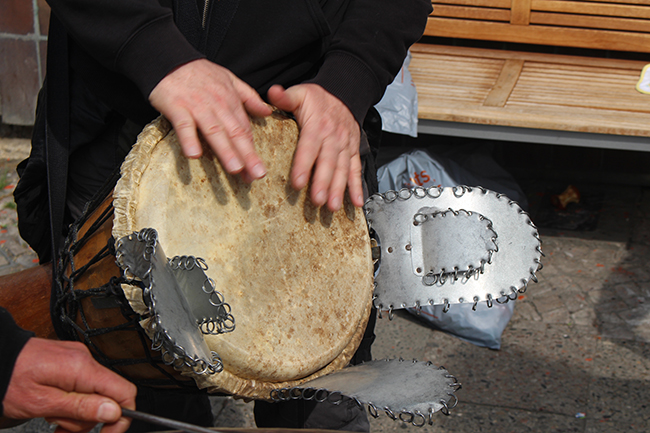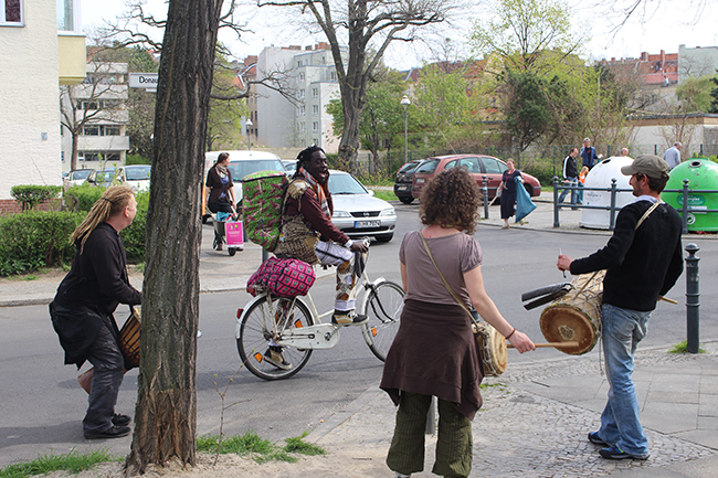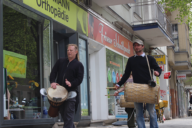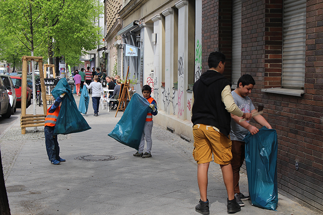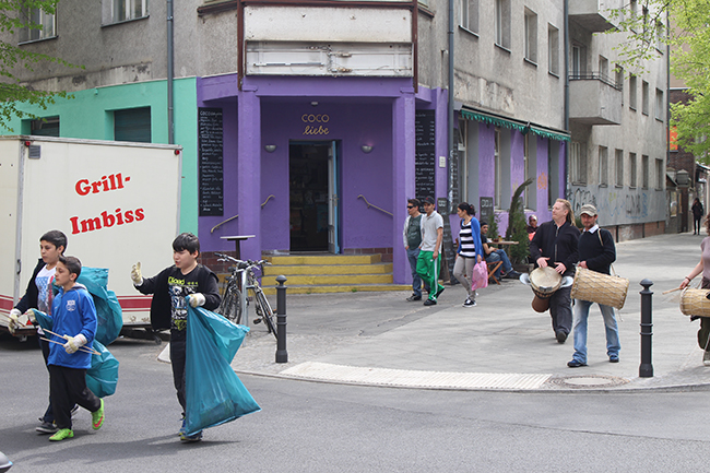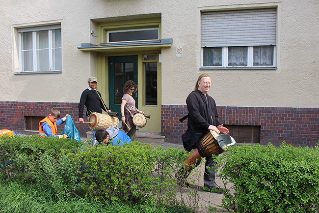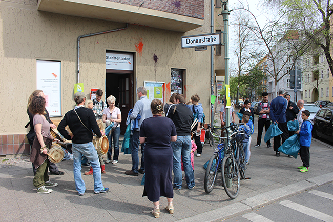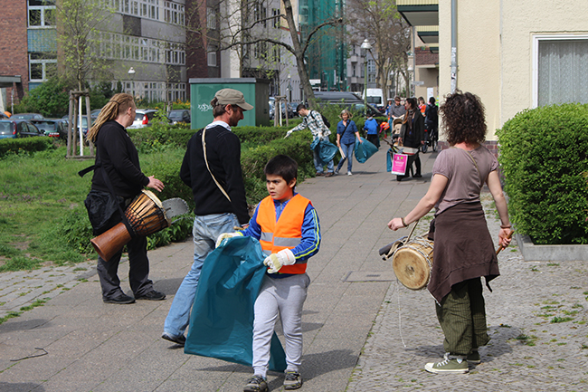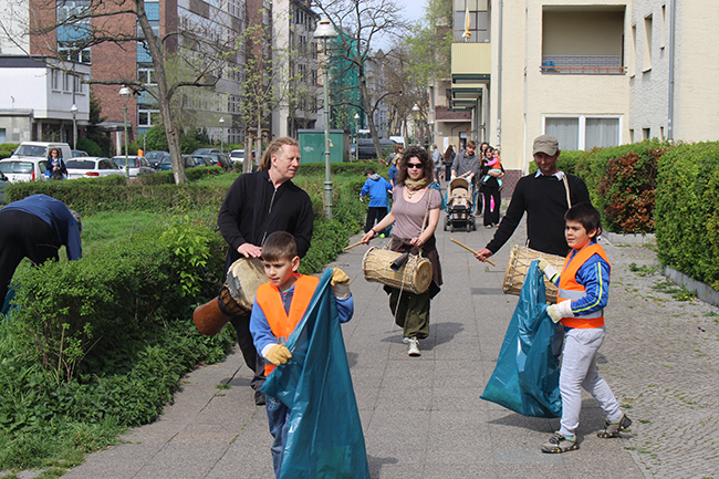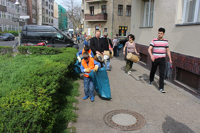 Der Frühjahrsputz wurde seiner Ankündigung gerecht: Es war ein besenbeschwingter Spaziergang durch den Kiez, mit Trommelrythmen und mehr Spaß als Arbeit. Die fleißgsten Müllsammler waren die Kinder, die mit ihren Holzzangen auch noch die kleinsten Plastikteilchen von den Gehwegen und aus den Hecken holten. Diejenigen, die die meisten Teile (nicht die größten oder schwersten) sammelten, erhielten zum Schluss einen Preis.