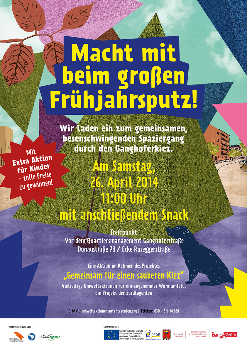 Am 26. April ist es wieder soweit: Die Stadtagenten und das Quartiersmanagement rufen alle Ganghoferkiezler dazu auf, mitzumachen beim Frühjahrsputz! Um 11:00 Uhr starten wir gemeinsam vom Büro des Quartiersmanagements mit einem Trommelwirbel der Percussion-Gruppe AFROKA und allen nötigen Utensilien, wie Handschuhen, Besen und Mülltüten, die uns auch dieses Jahr wieder netterweise von der BSR gestellt werden. Nach unserem besenschwingenden Spaziergang küren wir die Kinder, die den meisten Müll gesammelt haben, danach gibt es für alle ein paar leckere Snacks. Wir freuen uns auf Sie!Kritik und Ideen