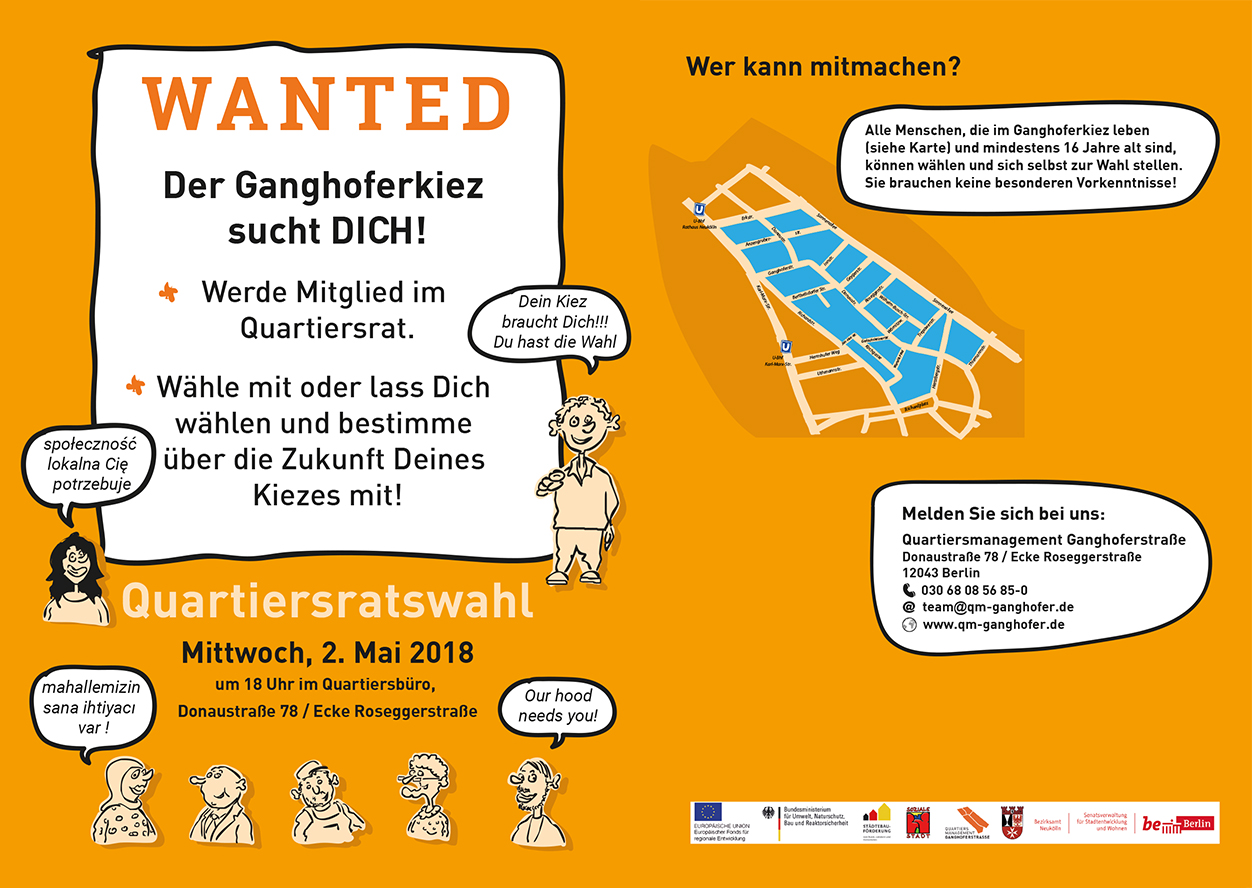 Am Mittwoch, den 2. Mai wird der Quartiersrat neu gewählt. Alle Menschen, die im Kiez wohnen und mindestens 16 Jahre alt sind, können sich zur Wahl stellen oder mitwählen. Wer Interesse hat, kann sich gerne im Quartiersbüro informieren.