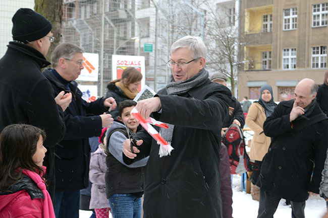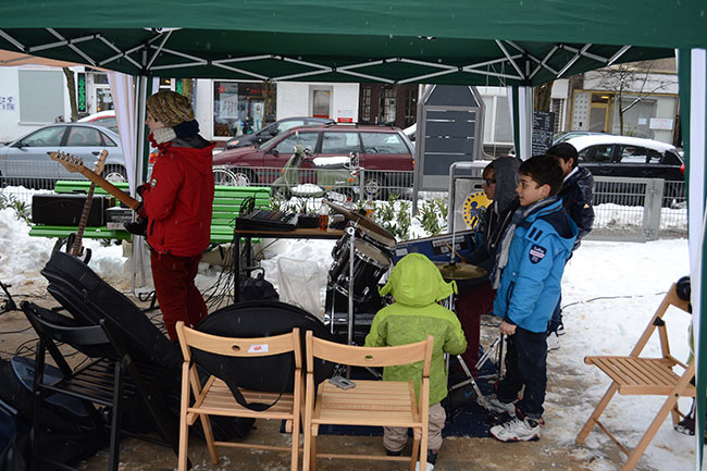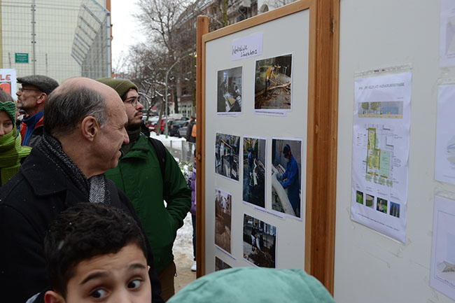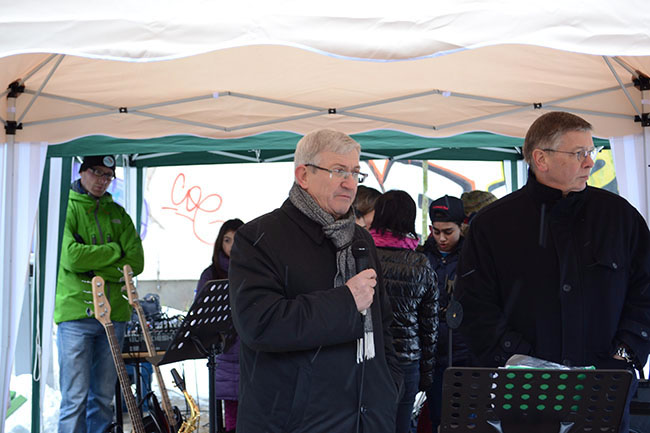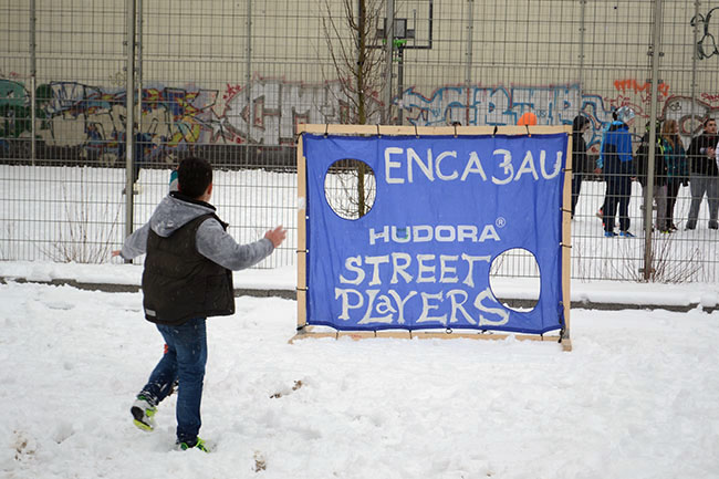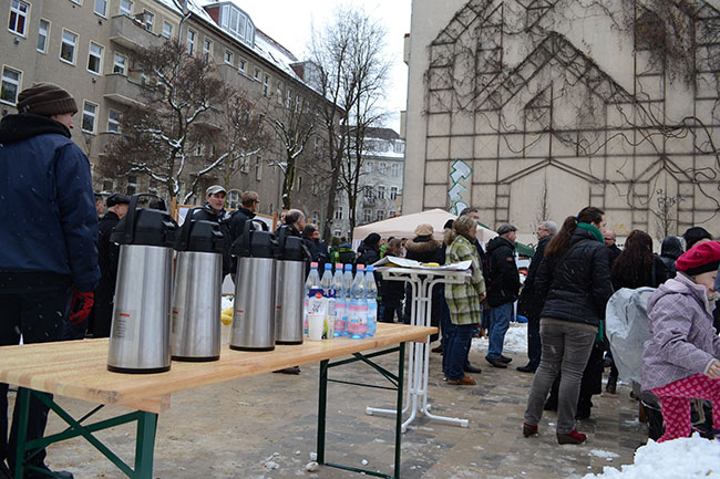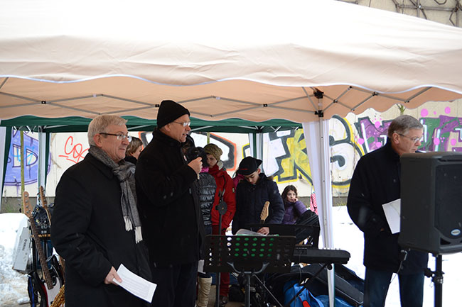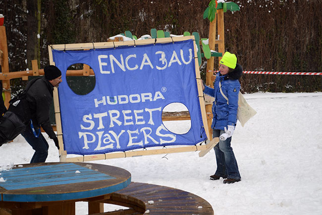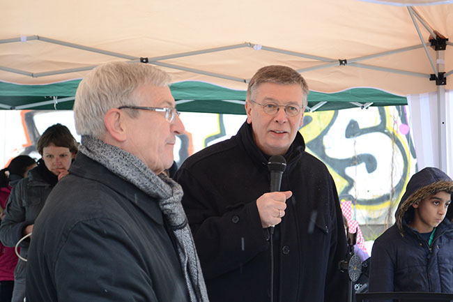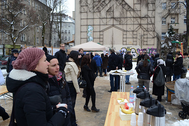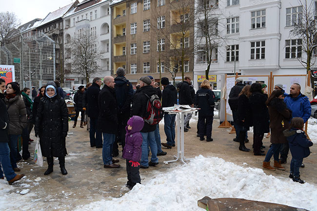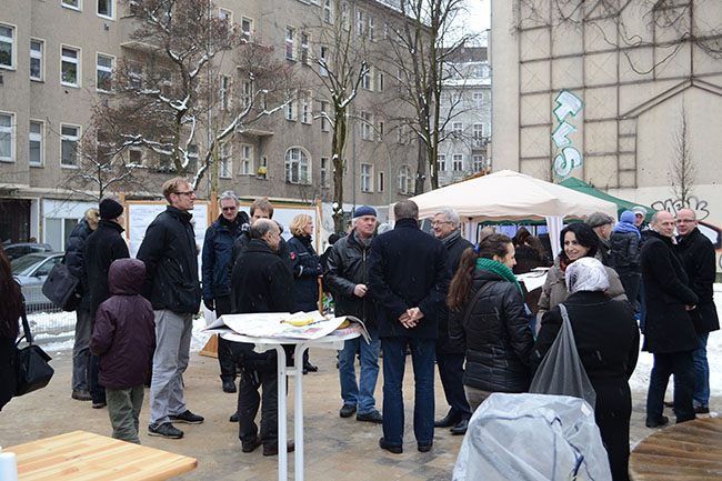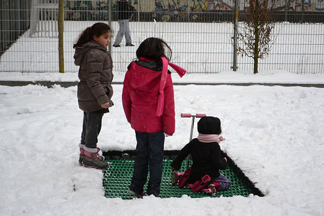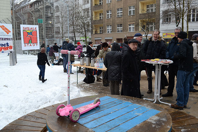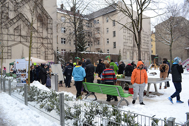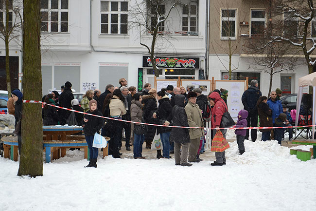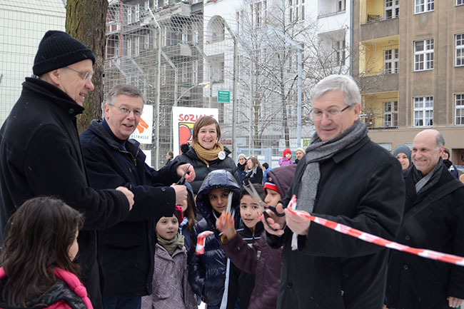 "Gutes Quartiersmanagement lässt sich nicht aufhalten, auch nicht durch Eis und Schnee", sagte Ulli Lautenschläger, Quartiersmanager im Gebiet Ganghoferstraße anlässlich der Eröffnung des runderneuerten Spiel- und Bolzplatzes Anzengruberstraße am 21. März 2013 . Der Platz war gefüllt, es waren VertreterInnen des Bezirksamtes da, des Senats, Nachbarn, jede Menge Kinder mit und ohne Eltern und natürlich alle, die mitgeholfen hatten, den Spiel- und Bolzplatz umzubauen. Ein im positiven Sinn "beispielloses Verfahren" nannte Baustadtrat Thomas Blesing den Weg bis zum renovierten Platz, denn von Anfang an wurde größten Wert auf Bürgerbeteiligung gelegt. Viele der gesammelten Ideen konnten umgesetzt werden und gleichzeitig wurde das lange Zeit kritische Verhältnis der Nachbarn zum Platz befriedet. Wolf Schulgen, Vertreter der Senatsverwaltung für Stadtentwicklung und Umwelt, und dort zuständig für die Quartiersmanagementgebiete, freute sich in seiner Rede über den Erhalt einer der wenigen freien Flächen im dichtbebauten Neukölln. Viel war während der Eröffnungsfeier von der Fläche indes nicht zu sehen. Zwar fand die Feier einen Tag nach Frühlingsanfang statt, allerdings bedeckte Eis und Schnee den Platz. Die Big Band der Richard-Grundschule, die den musikalischen Teil übernommen hatte, musste die Instrumente ungespielt wieder einpacken, da sie zu feucht geworden waren.